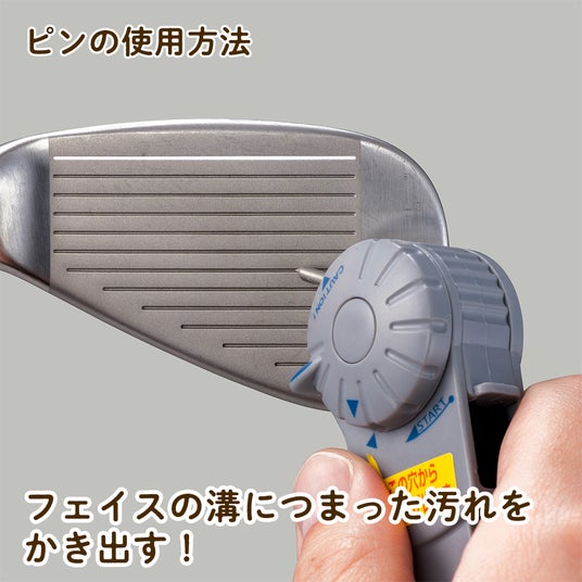 丸いダイヤル部分についている突起を矢印方向に回すとピンが出てきます。ピンはクラブフェイスの溝につまった汚れをかき出すことができます。