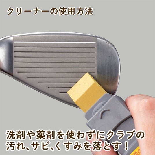 洗剤や薬剤を使用せずにクラブの汚れ、サビ、くすみなどをこすると落とすことができます。クリーナーは取り外しすることができ、汚れた面の全体をハード(青色)で落とし、残った細かい汚れをソフト(黄色)で落とします。