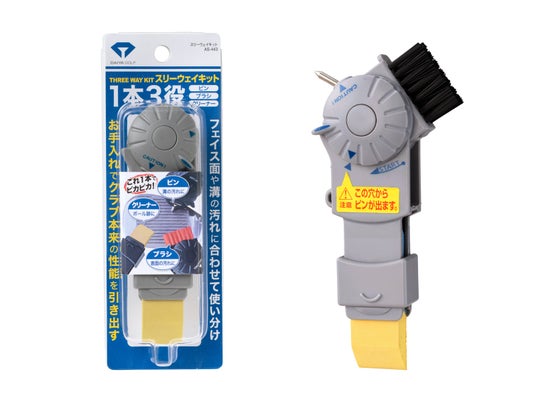 このたび、『スリーウェイキット』の新カラー、グレーを追加発売します。ピンでアイアンの溝に詰まった泥や砂をかき出し、出てきた汚れや芝などはブラシで掃除できます。反対側についているマジッククリーナーはクラブの汚れ、サビ、くすみ等を落とすために開発した薬剤や洗剤不要のクラブ専用クリーナーです。汚れ面をこするとクラブフェイスについたボール跡を落とせます。先細タイプなので細かいところにも使えます。ソフト(黄色)は、細目用、ハード(青色)は荒目用です。