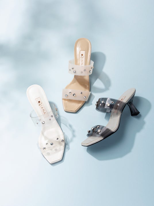 PVCの甲ベルトにラインストーンをあしらったミュール。ヒールもクリア素材を使用し、ヌーディーな足元を演出。 PVCベルトを2重にすることで、金具が直接足に当たって痛くなりにくいよう、履きやすい仕様に仕上げました。