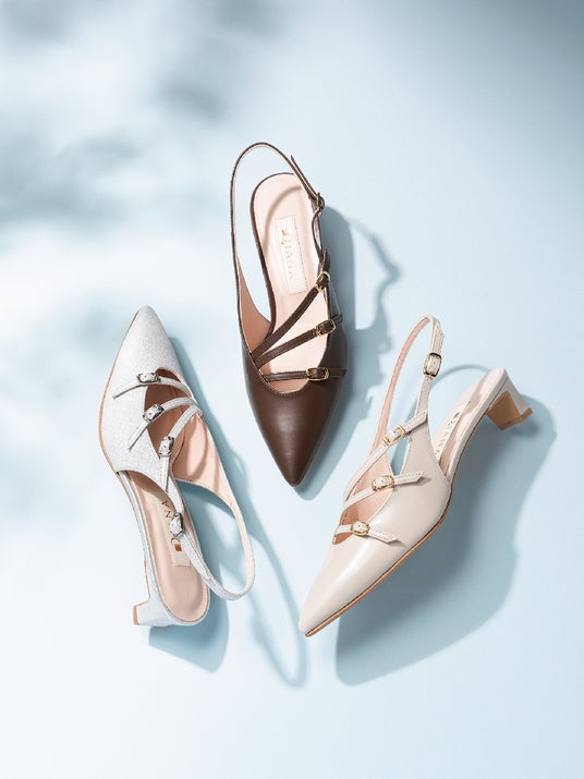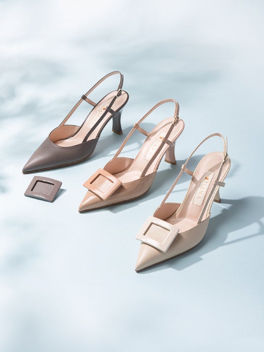 という思いから、取り外しのできるバックルをあしらったバックストラップパンプス。ロングノーズのポインテッドトゥで、履くだけで足元をスッキリと魅せてくれるパンプス。