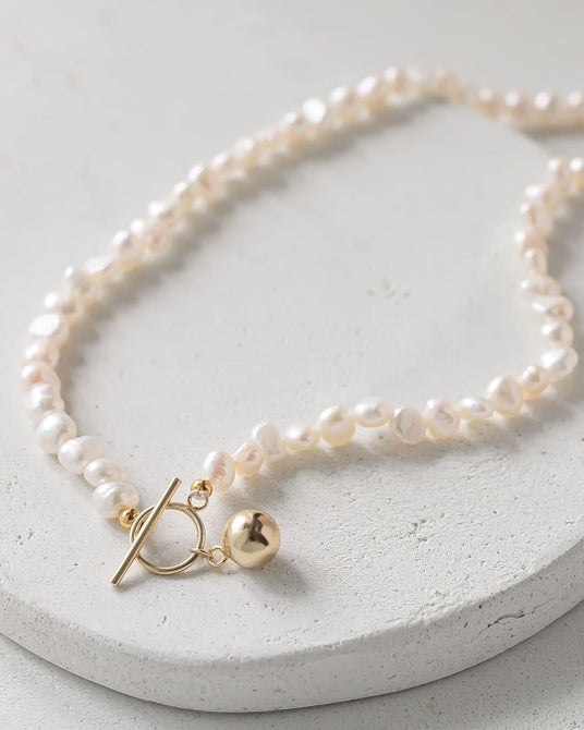 小ぶりながらも、存在感を放つ淡水パールをあしらったネックレス。