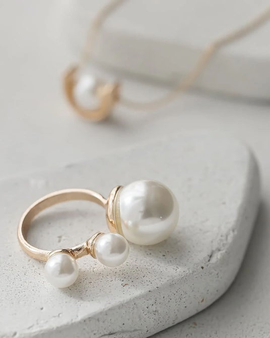 大小大きさの異なるパールが指先にアクセントをプラスしてくれるリング。