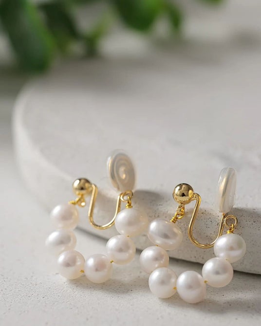 約6mmの大粒淡水パールが6つ連なりフープ状になったデザインのイヤリング。
