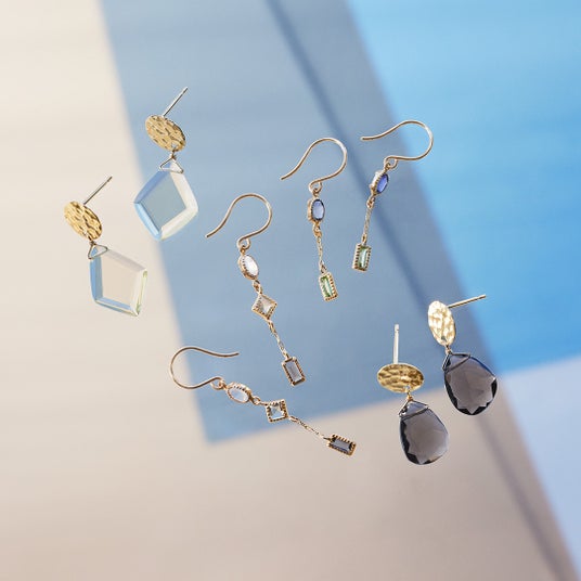From left pierced earrings 23,100yen/ K10, gold filled metal and quartz 34,100yen/ K10, moonstone and quartz 25,300yen/ K10, iolite and peridot 23,100yen/ K10, gold filled metal and quartz (2024年4月12日(金)発売)