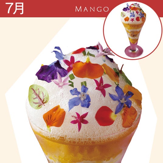 濃厚な果汁のアメリカンチェリーに、コクのあるピスタチオアイスとバニラアイス、アールグレイのジュレ、クランブル、ルビーチョコの飾りをつけて上品かつ見た目もゴージャスに。目でもお楽しみいただけるアートなパフェです。7月 マンゴーのパフェ ¥2,400