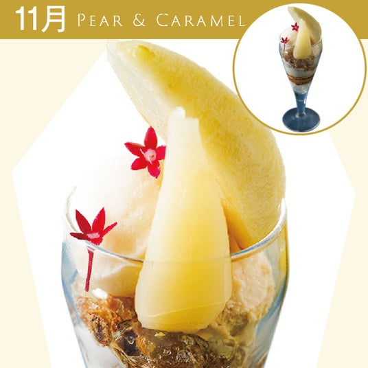 柔らかな柿のコンポートとシャインマスカットを濃厚なホワイトチョコレートのクリーム、葡萄のシャーベットとマスカルポーネアイス、爽やかなマスカットのジュレで上品に仕上げました。フレッシュな柿も添えて秋ならではのスイーツをお楽しみください11月 洋梨とキャラメルのパフェ ¥2,100