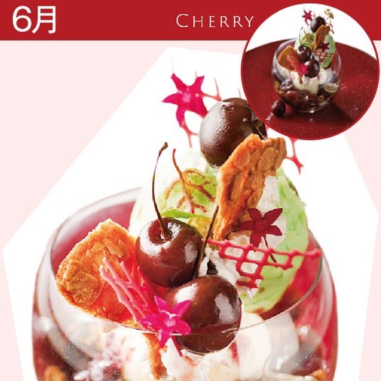 一口で爽やかさと華やかさを感じる、オレンジソルベと白ワインジュレ。焼き柑橘の香ばしさとカスタードクリームが絶妙なバランスを。クランブルの食感やホワイトチョコレートとの相性をお楽しみください。6月 アメリカンチェリーのパフェ ¥2,300