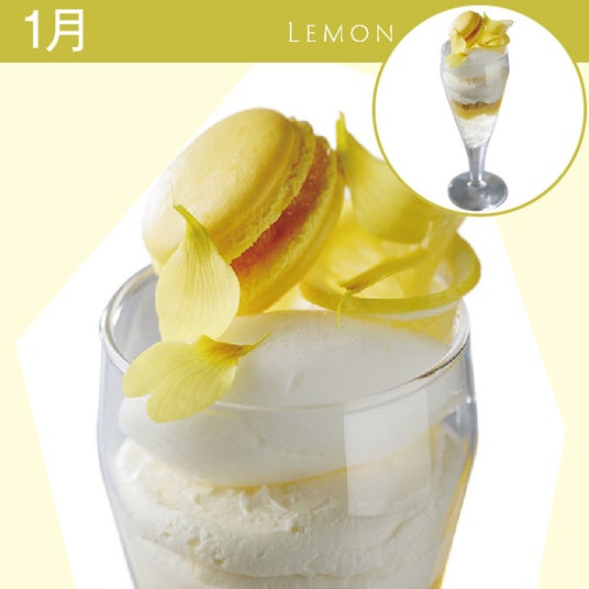 しっとりチョコクッキーとパイのサクサク感。ピスタチオアイスの風味が広がり、メレンゲの雪だるまと苺のサンタクロースがおいしさをキュートに演出する王道のチョコパフェです。1月 国産レモンのパフェ ¥2,100