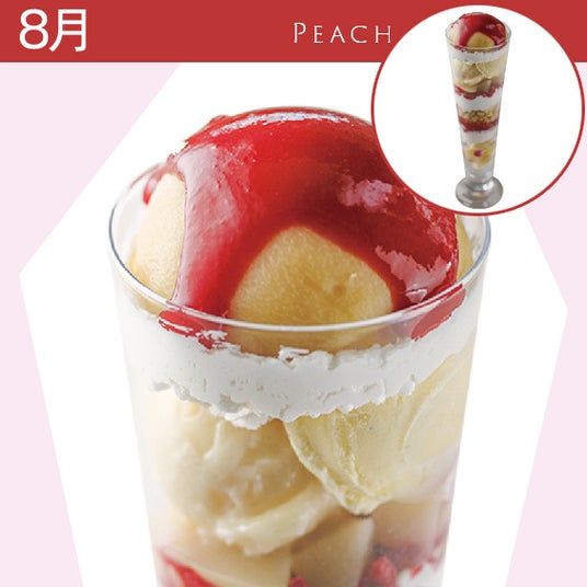 マンゴーの芳醇な香りとマスカルポーネの濃厚な味わいが絶妙!カラフルなエディブルフラワーが可愛らしい一品です。レモンの泡がアクセントとなり、さらに爽やかさをプラス。ワッフルやクランブルの食感も楽しめる夏にぴったりのマンゴーパフェです。8月 桃のパフェ ¥2,300