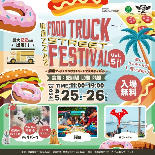 株式会社TryHard Japan(所在地:大阪市中央区)は、2024年5月25日(土)、26日(日)の2日間、SENNAN LONG PARK(センナンロングパーク)にて、グルメフェス「FOOD TRUCK STREET FESTIVAL vol.5」を開催いたします。