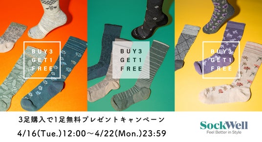 weskiii(ウェスキー)株式会社(本社:東京都港区 https://weskiii.com/ )が運営するセルフケアソックスブランド「Sockwell(ソックウェル)」から、日頃の感謝を込めて4/16(火)~22(月)までの期間中、ソックウェル公式サイトで4足分カートに追加して購入した方を対象に、1足分無料となる「BUY3 GET1 FREE!!キャンペーン」を行います。