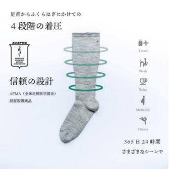 ソックウェルの商品は、全米足病医学協会(APMA)からの認証を受けています。本認証は、足病分野において世界的な権威を持つ医師の審査を通過することで与えられ、製品が足の健康維持、継続的な使用における足のケア・リカバリーに非常に高い効果があることが認められたことを示します。