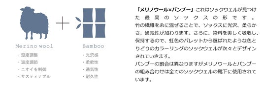 より良い履き心地を追求するために、ソックウェルではバンブーやアルパカなどの繊維とメリノウールを掛け合わせたオリジナル紡績を使用しています。