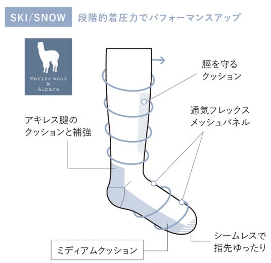 アルパカにはメリノウールの利点を高める効果があります。メリノウールの持つ湿度と温度の調整機能、防臭効果を次のレベルへ引き上げ、さらにアルパカならではの柔らかさをソックスにプラスします。