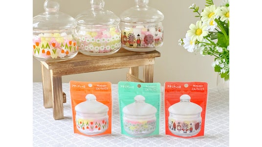 昭和のレトロかわいさが人気の「アデリアレトロのボンボン入れ360」と、昔から愛され続けている小さくて愛らしい見た目の「こんぺいとう」の世界観がマッチするのでは、という発想から今回のコラボが実現しました。第1弾は、春のうららかなおひさまと花畑をイメージし、こんぺいとうはピンク・白・黄色3色を選定しました。