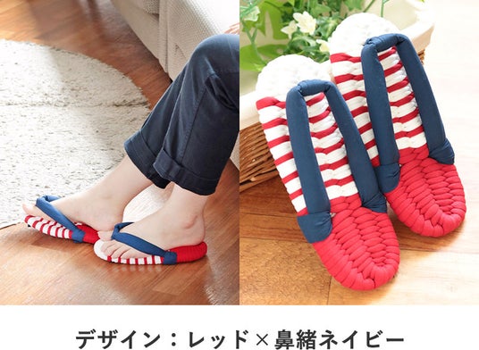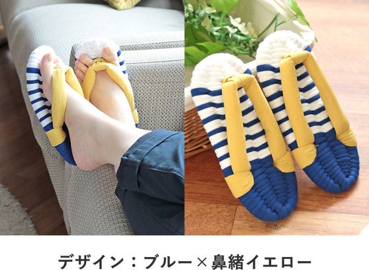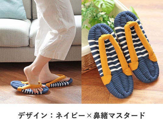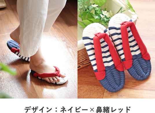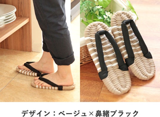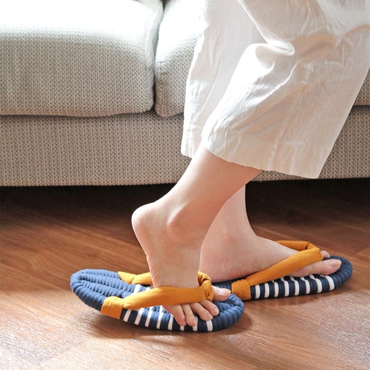 室内履きと言えばスリッパですが、スリッパは足先にひっかけて引きずるように歩くので、足首は動かず筋肉を使いません。布ぞうりは足の指で鼻緒を挟んで履くので、自然と足の筋肉を使います。