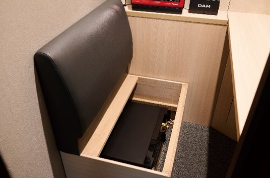 カラオケ機器の収納には、ベンチ型シート下のスペースを活用。閉塞感を感じないよう十分なスペースを確保。