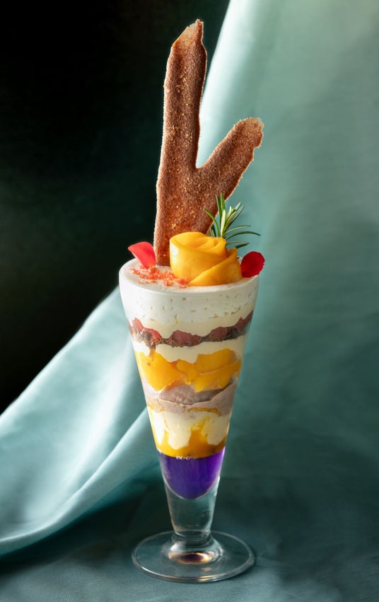 中部から下部にかけて甘酸っぱいピンクグレープフルーツのコンフィチュールや、マンゴー・パッションフルーツのクリーム、ローズマリーアイス、ブリュレクリームと多様な味わいの層を重ねました。マンゴーの濃厚な甘みとグレープフルーツの酸味、2つの味わいのマリアージュをお楽しみいただけます。