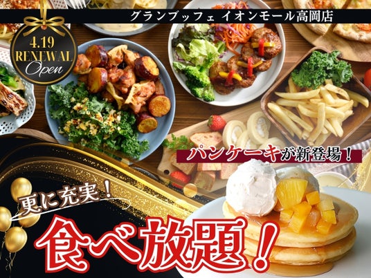 世代を超えて楽しめるバラエティー豊かな食べ放題が楽しめる「グランブッフェ イオンモール高岡店」。この度、2024年4月19日(金)より、装い新たにリニューアルOPENいたします!