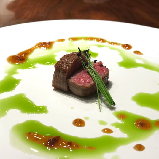 最高級の部位と称され柔らかな肉質が特徴の牛ヒレに、干梅と紹興酒を使用したまろやかな甘みのソースと青葱から抽出したオイルを添えました。