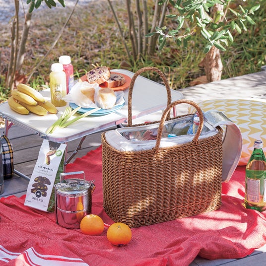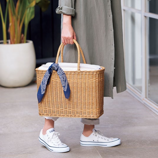 水に強いラタン調素材を、おしゃれなカゴバッグに編み上げ、コンビニ弁当やワインボトルも入るサイズに。取り外しできる保冷バッグ付きで、生ものや冷やした飲み物なども安心して持ち運べます。