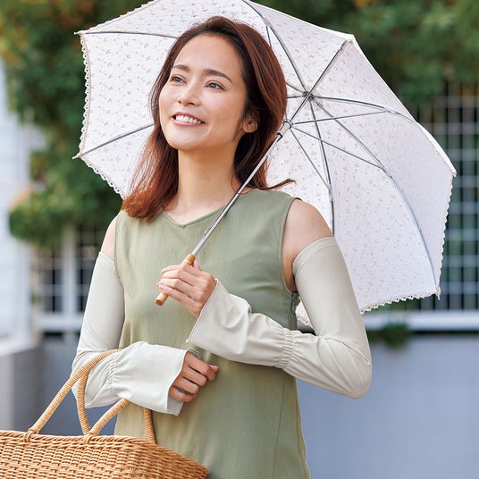 「この素材なら夏も乗り切れる!」と担当が自信を持って作りました。自転車でのお買い物やお出かけ、ペットの散歩など、サッと着用して日焼けしやすい腕を紫外線から守ります。袖はゴムが入ったフレアデザインで、さりげないおしゃれにこだわりました。