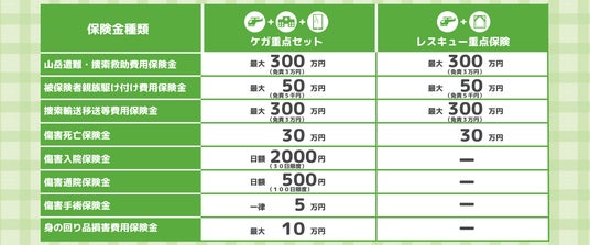 具体的な補償としては、警察が認定した遭難における捜索費用、遭難捜査時における親族の駆け付け費用、遭難者の重症時等の移送費用、ケガによって死亡した場合の保険金、入院した場合の保険金、通院した場合の保険金、手術した場合の保険金、そしてケガと共に携行品が壊れた場合の費用を支払うものです。