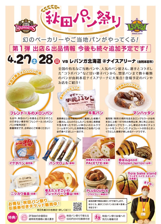 4月27日(土)、4月28日(日)に由利本荘市(ナイスアリーナ)で開催されるレバンガ北海道戦で、“秋田パン祭り”を開催します!全国の有名なご当地パンや、人気のパン屋さん、選手とコラボした”コラボパン”など甘い菓子パンから、惣菜パンまで数十種類のパンがずらり由利本荘ナイスアリーナに大集合!登場予定のパンやお店を紹介します!また5月6日(土)はキッズデーと題し、子どもが楽しめるイベントを多数開催予定。