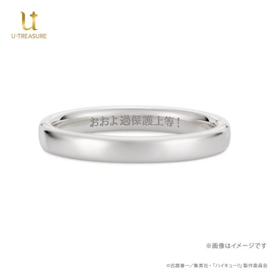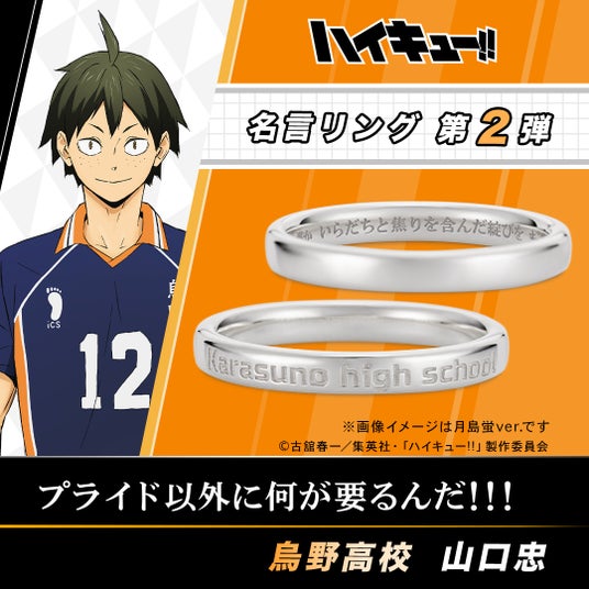 『烏野高校(Karasuno high school)』の校名をデザインしたリングの内側に、印象的なエピソードがよみがえる各キャラクターの名言を刻みました。
