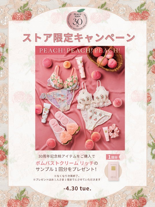 さらに、PEACH JOHN新宿三丁目店限定で30周年を記念した特設ディスプレイを展開。対象商品のご購入で「ボムバストクリーム リッチ」のサンプルをプレゼントする店舗限定のキャンペーンも実施します。