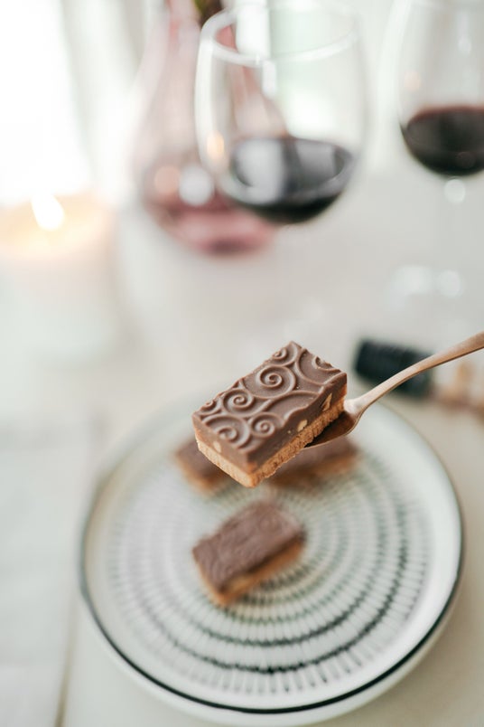 合わせるのはPOIREのチョコレートヌガーバー。バニュルスの味わいに寄り添う口溶けの良いチョコレート、熟成由来のワインフレーヴァーにマッチするカラメル、さらにその2つを支えながら香ばしい風味と食感を生み出すクッキー生地。全てが絶妙に調和し口の中に贅沢に広がります。