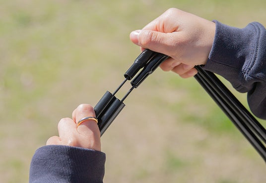 組み立て方はとても簡単。ファスナーを開き、収納されている脚をショックコード(ゴム紐)に沿って組み立てるだけ。収納する際も組み立てと逆の手順で収納バッグに収めれば完了します。収納バッグ一体型なので、しまうための袋の置き場にも困ることがありません。
