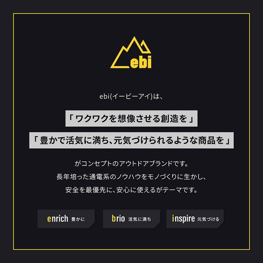オウルテックのアウトドア新ブランドは、e:enrich「豊かに」、b:brio「活気に満ち」、i:inspire「元気づける」の頭文字を取り、ブランドネーム「ebi(イービーアイ)」として「豊かで活気に満ち、元気づけられるような商品を」をコンセプトにしています。