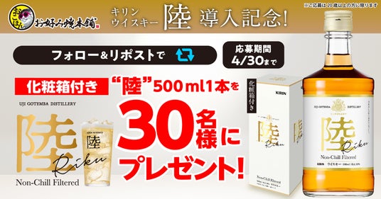 株式会社物語コーポレーション(本社:愛知県豊橋市/代表取締役社長:加藤 央之)が全国で21店舗展開中の『お好み焼本舗』は、店内での新アルコールメニューへの「キリンウイスキー 陸(R)」の導入を記念して、 「キリンウイスキー 陸(R) 500ml」を30名様にプレゼントするキャンペーンを開催いたします。