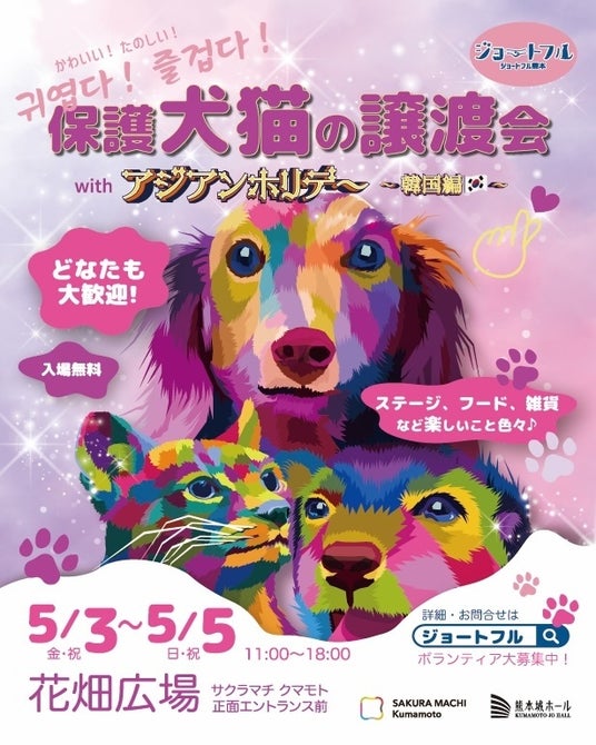 2024年5月3日(金・祝)~5月5日(日・祝)、花畑広場(熊本市中央区)にて「保護犬猫の譲渡会 with アジアンホリデー ~韓国編~」を開催。どなたでも歓迎、入場無料。運営ボランティアも募集。