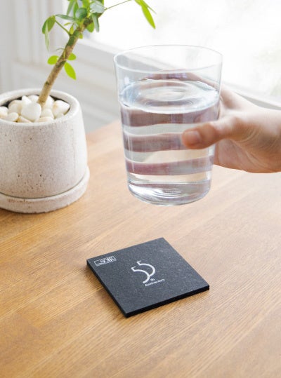 作成したブラックフォーマルの「PANECO(R)」は、カットやプリントなどの加工を施して東京ソワール創立55周年記念ノベルティの「オリジナルコースター」として活用。