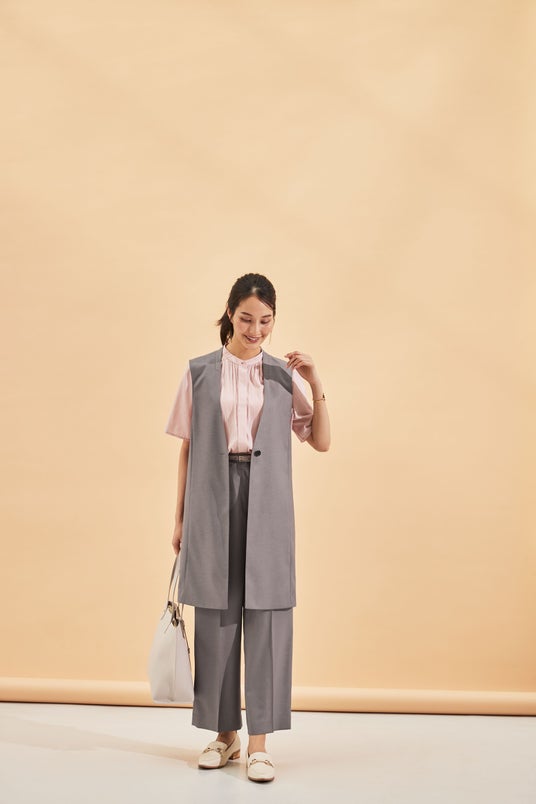 今季はオフィスカジュアルアイテムとして人気の高いジレを新たに追加。色は使いやすい紺、トレンド感のある茶、夏らしいライトグレーの3色で展開いたします。
