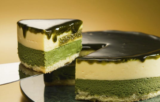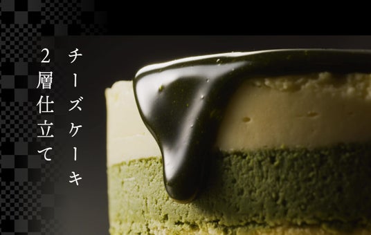 下層は抹茶のベイクドチーズケーキ。上層はレアチーズのムース。表面には抹茶のナパージュをかけ濃い抹茶の苦みを感じるチーズケーキです。