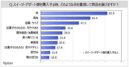 スイーツ・デザート類を購入する人に、どのような点を重視して商品を選ぶかを聞きました(複数回答)。「味」が82.5%、「価格」が61.4%、「容量、サイズ」が47.3%、「形や大きさ」が30.6%です。