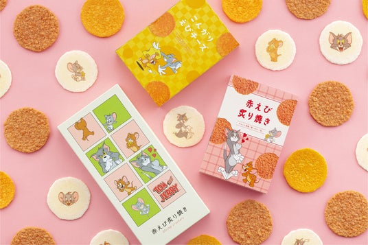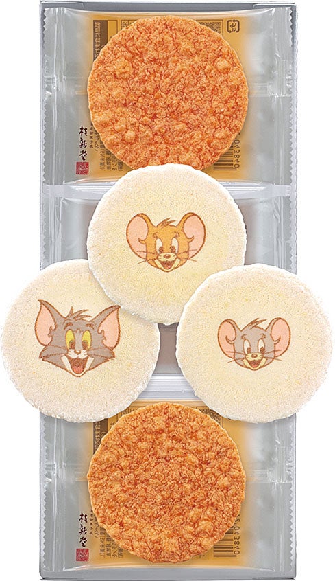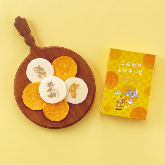 ジェリーとタフィーの大好物・チーズをえびせんべいに押し当て焼き上げた「こんがりえびチーズ」と、トム、ジェリー、タフィーを描いたえびせんべいの詰め合わせです。