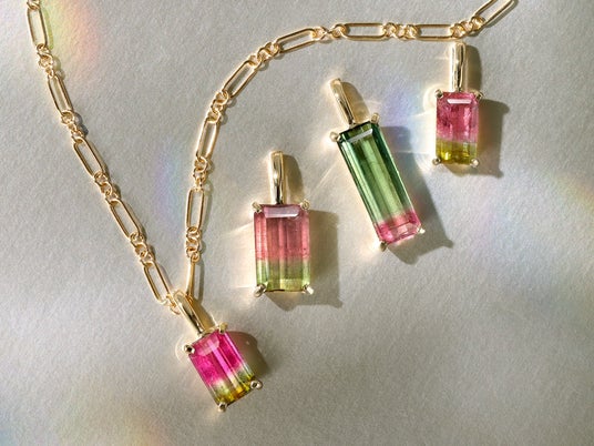 もう一種は、ピンクとグリーンのコントラストが神秘的な「バイカラートルマリン K18ペンダントトップ・セラム」(税込99,000~115,500円)です。結晶化する過程で環境の変化を受け、グリーンとピンクの2色になった石は、まさに地球が生んだ芸術品です。宝石は、美しいグラデーションを堪能いただけるよう、長方形のバゲットカットにしています。縦長のスタイリッシュなフォルムが印象的で、オンオフ問わず使いやすいアイテムです。地金は18金イエローゴールドです。