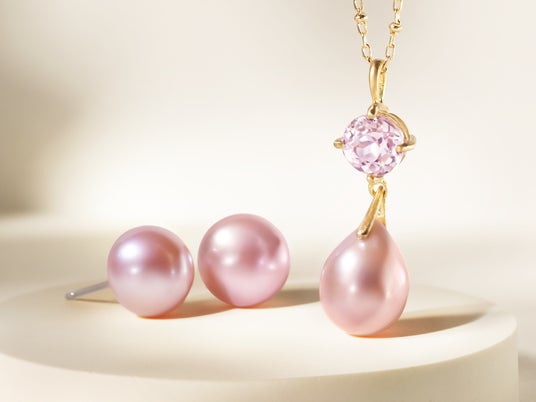 新商品「湖水真珠×クンツァイト K18ペンダントトップ・トレン」(税込143,000円)は、異素材の質感の違いを楽しめるジュエリーです。上部には、約7ミリと大粒の「クンツァイト」を、下部には約8.5ミリの湖水真珠をあしらっています。澄んだ煌めきを放つ“ニュアンスピンク”の「クンツァイト」と、メタリックとも言えるほどのつやを放つパープルカラーの真珠の組み合わせが艶やかなアイテムです。地金は、18金イエローゴールドです。