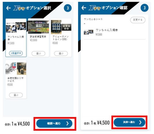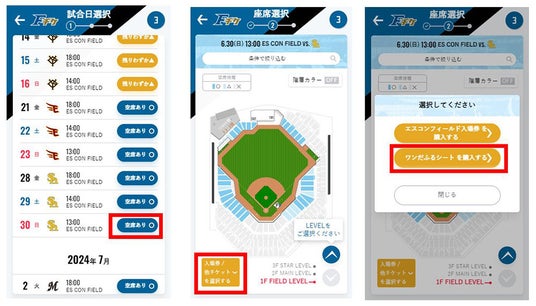 2.球場図左下の「入場券/他チケット」を選択し「ワンだふるシート」を選択