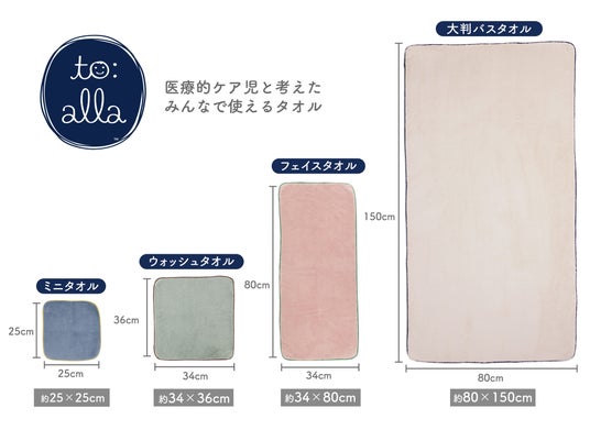 タオルを多数使用し、頻繁に買い替えの必要があるご家庭にも手に取りやすい低価格帯です。また、to:alla(トアラ)の売り上げの一部はNPO法人アンリーシュへ寄付され、医療的ケアが必要な子どもの生活情報の充実、医療的ケア児家族が輝ける場の創出に役立てられます。