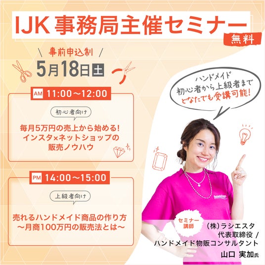 近年、来場者数が増加しているのがハンドメイド作家や美容サロン経営者、インフルエンサーである。本年は最終日である5月18日[土]に、ハンドメイド作家向けのセミナーを開催する。ハンドメイドで起業を検討中の方や、ハンドメイド作家としてヒット商品を生み出したい方に、ぜひ受講を勧めたい。講師は、自身もハンドメイドで月商100万円以上の売上げに成功し、ハンドメイド起業コンサルタントとして延べ700人以上のスキル啓発をしてきた山口 実加氏。満席となり次第、受付終了となるため、早めのお申込みを推奨する。