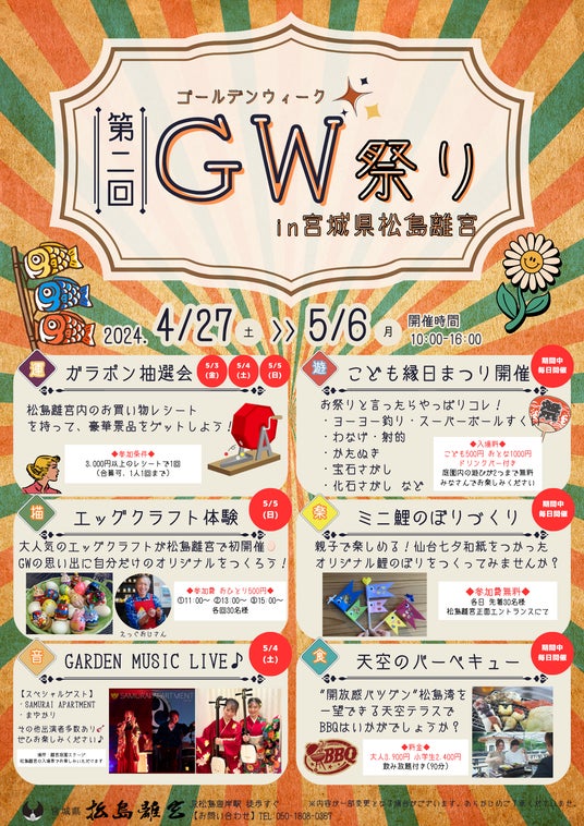GW期間中の2024年4月27日(土)~5月6日(日)まで、2つのイベントを毎日開催いたします。是非、GWは宮城県松島離宮にお越しください!