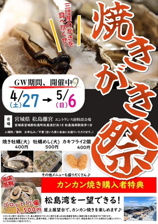 【GWイベント1】GW焼きがき祭開催!特設広場で三陸産の絶品かきを楽しもう♪松島といったら『かき』!