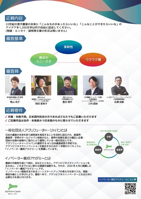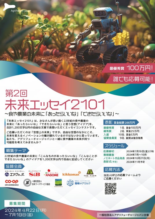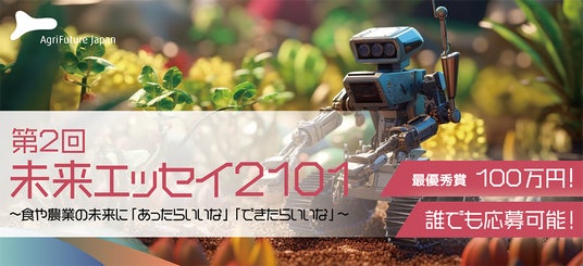 一般社団法人アグリフューチャージャパン(理事長:合瀬宏毅、東京都港区)は、昨年度に引き続き、22世紀の食や農業の未来に「あったらいいな」「できたらいいな」と思う空想(アイデア)を募集するエッセイコンテスト『未来エッセイ2101』 (以下、本コンテスト)を開催いたします。