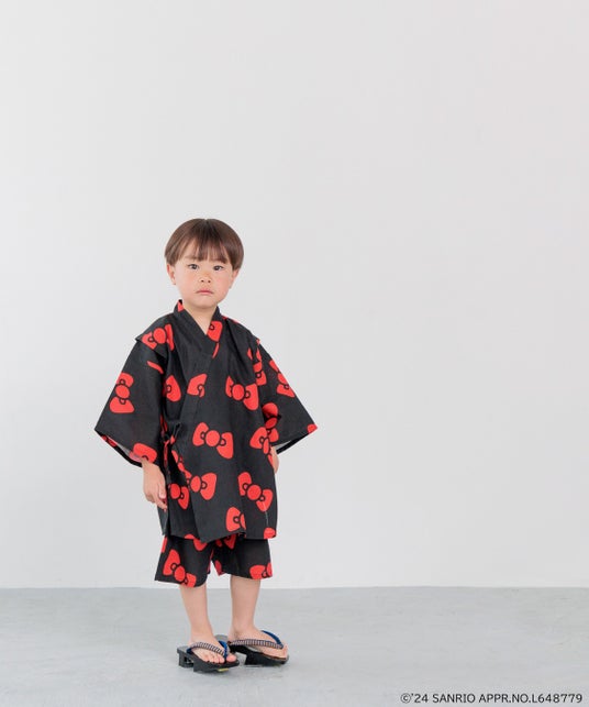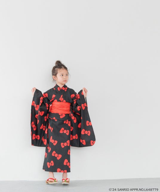 兵児帯がセットになったリボン柄の浴衣。親子や、友達同士でも楽しめて、この夏を盛り上げてくれること間違いなし。ハローキティのトレードマークでもあるリボン柄の浴衣は、ポップさもありつつ一目で“カワイイ”が伝わるLOWRYS FARMならではのアイテムです。